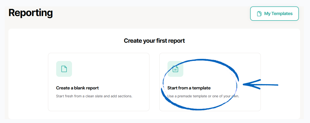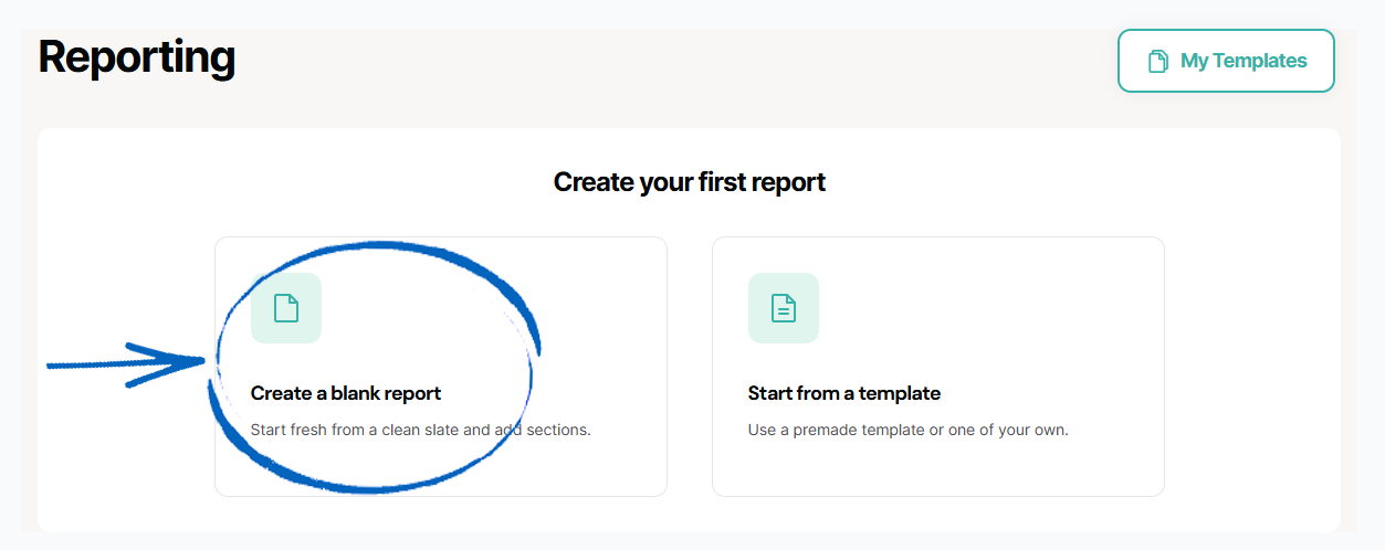2. You’ll then see two buttons. You can select to create a blank report of your own or start from a template report:
