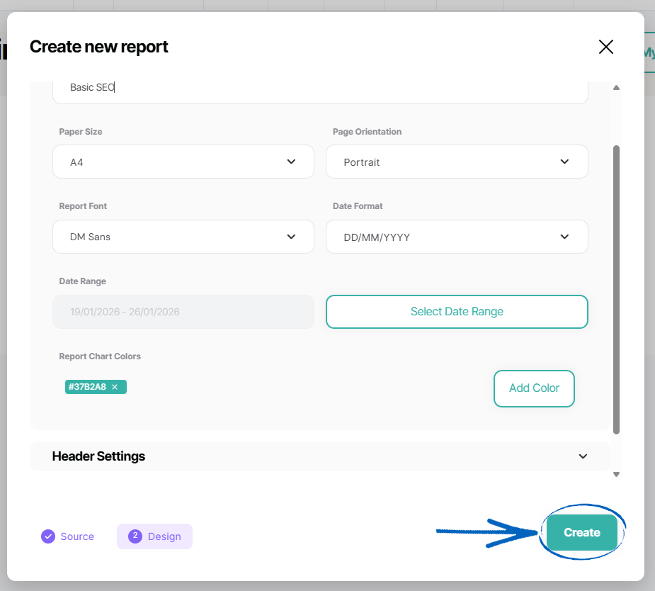 3. Then you need to customise your report by completing the fields and using the drop-down options, before clicking the Create button: