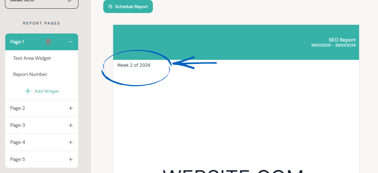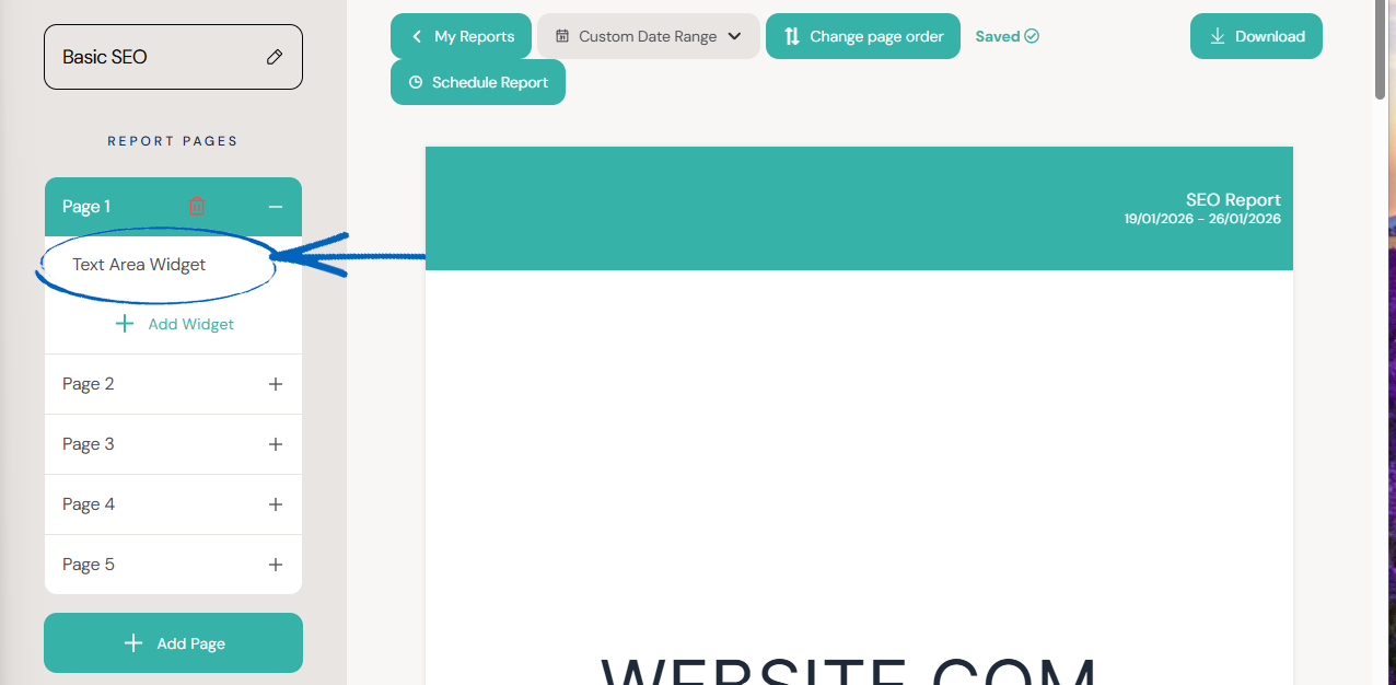 5. You’ll then see this page, where you can scroll down through the different pages of your report. On the left-hand side, if you hover over the ‘Text Area Widget’, you’ll see an edit button and a delete button appear. You can use these to edit the text on the first page.