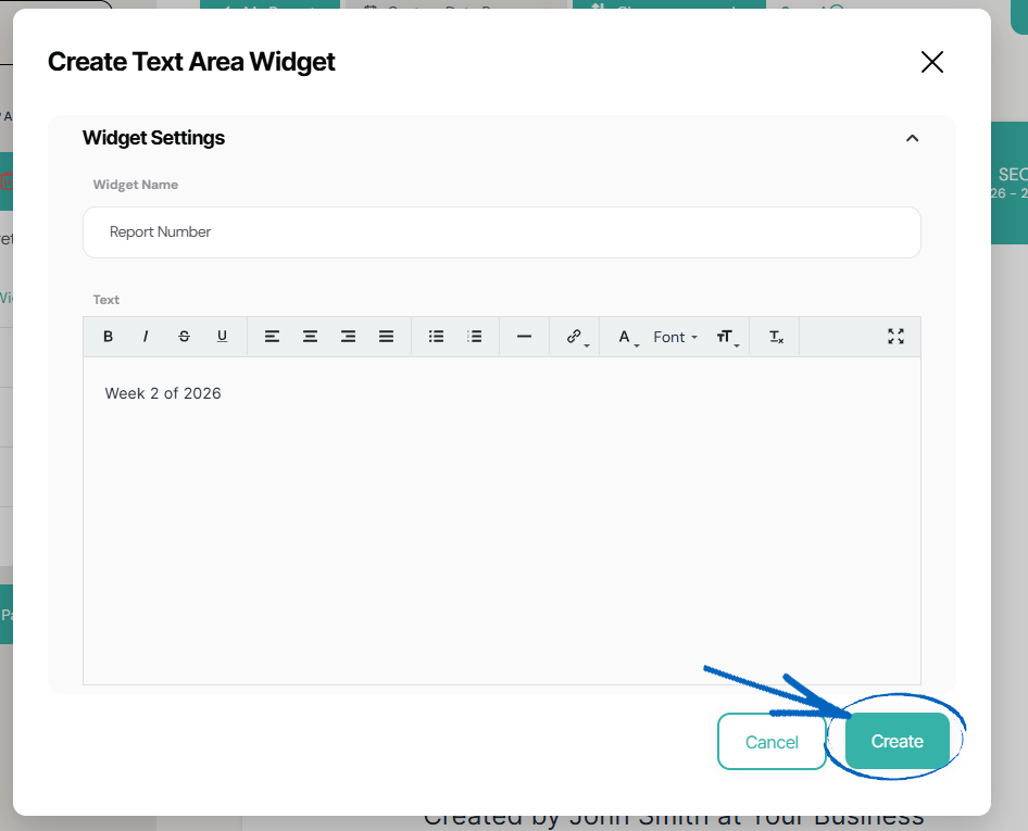 7. When you have selected your widget, you can make changes to it using the fields provided, before clicking Create in the bottom right-hand corner: