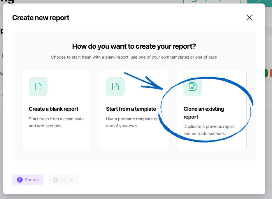 [remember] When you have created a report for the first time, when you return to the Report Builder page, you will be able to see the option to clone an existing report if you wish to copy a report you’ve previously created, using different data ranges: