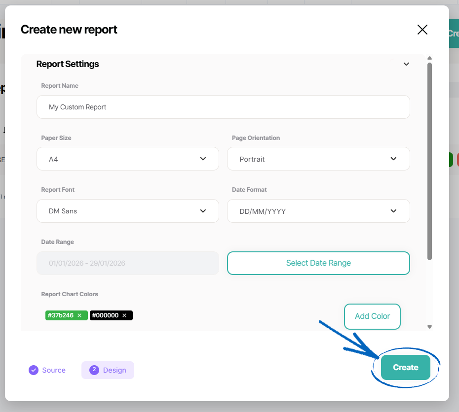 2. Then you need to customise your report by completing the fields and using the drop-down options, before clicking the Create button: