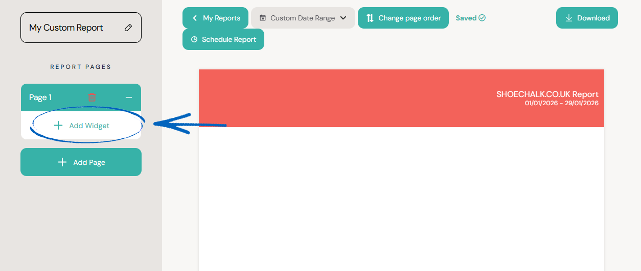 4. You’ll then see this page, which is a layout editor for your report. It will be empty because we haven't added any data yet. To add data, click Add Widget on the left-hand side: