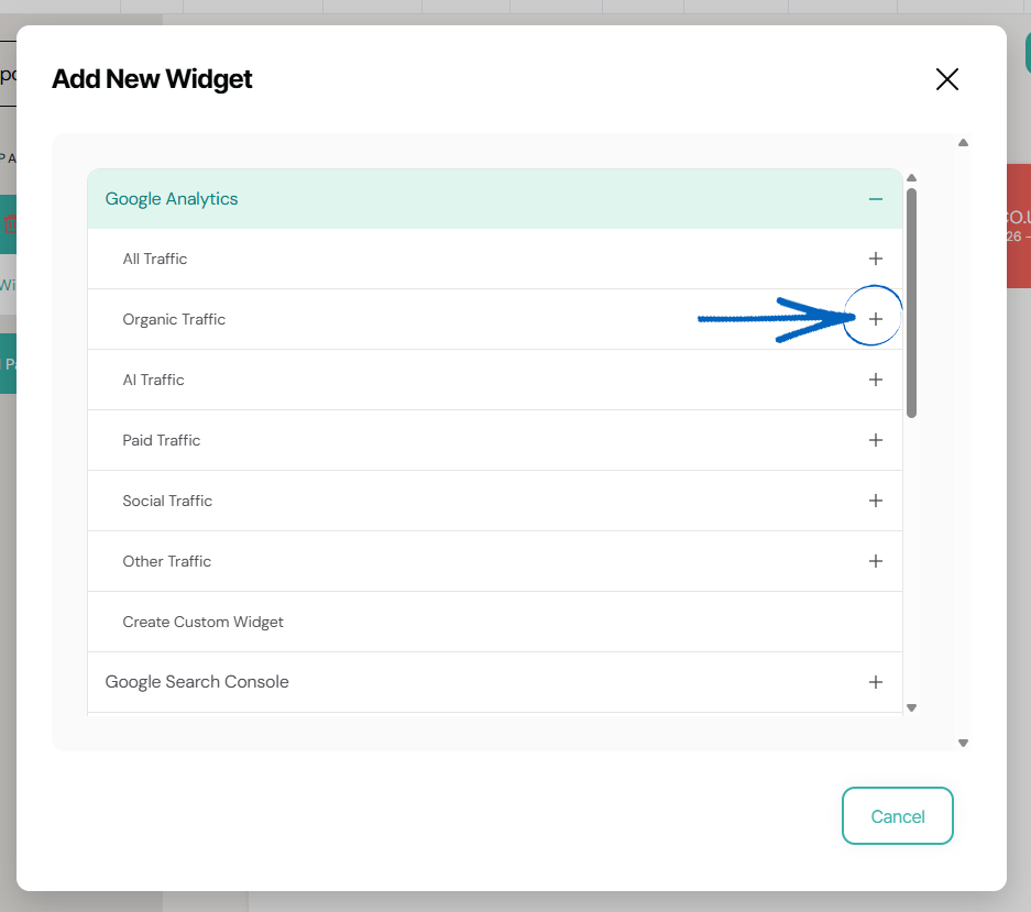 6. You can also click to add widgets to specific pages, which will make this modal appear. Click the plus symbols on the right-hand side to choose what widget you would like to appear on your report: