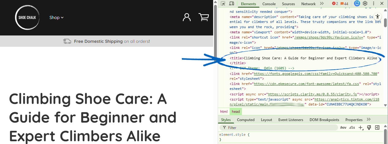 The title tag is an important HTML element that is located on every page (specifically in the head section) and helps search engines to determine the relevance of a page’s topic. In Google, the text in the blue link is the page title that is pulled from the web page. For example, on this EKM online shop blog post, you can see the <title></title> tag when you view the HTML source code: