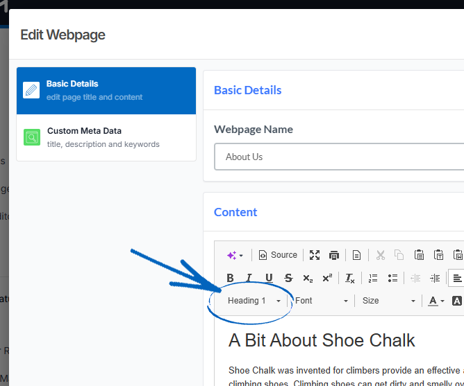 On your EKM online shop, the heading tags are the names of the Products or Categories, and you can add additional tags within their descriptions. On the Homepage, your heading tags are typically above any text elements. On Webpages, you can select the highlight text and select the relevant heading tag by using the button on the top left-hand side: