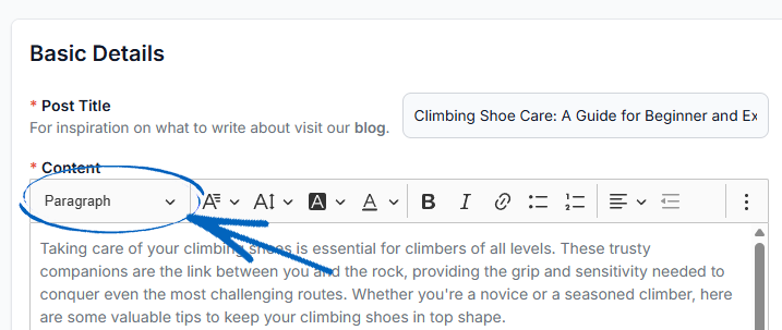 If you’re using the EKM Blogs feature, you can highlight text and select the relevant heading tag by using the button in the top left-hand corner: