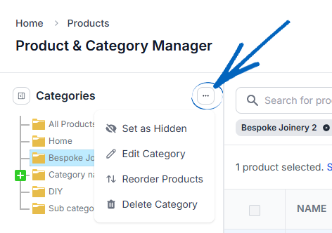 8. This will reveal some options for editing the category within the Category Tree. You can set the select category as Hidden, Edit that category by opening the Add/Edit Category window, reorder the products within the Category or delete the category: