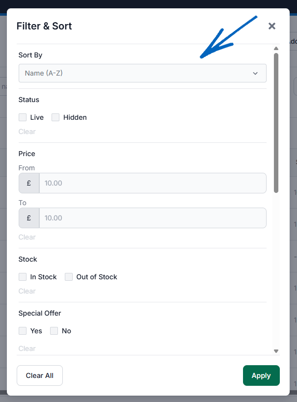 12. Clicking the Filter& Sort button will open this modal, where you can use the filters to search for specific products: