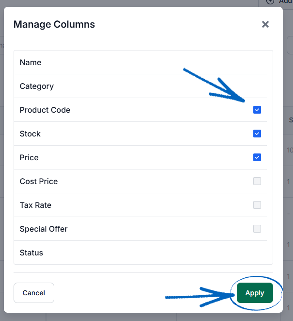 16. In the modal that appears, you can use the tick boxes to select what information you would like displayed for each of your products within the Product & Category Manager. Simply select the relevant boxes and click the green Apply button in the bottom right-hand corner: