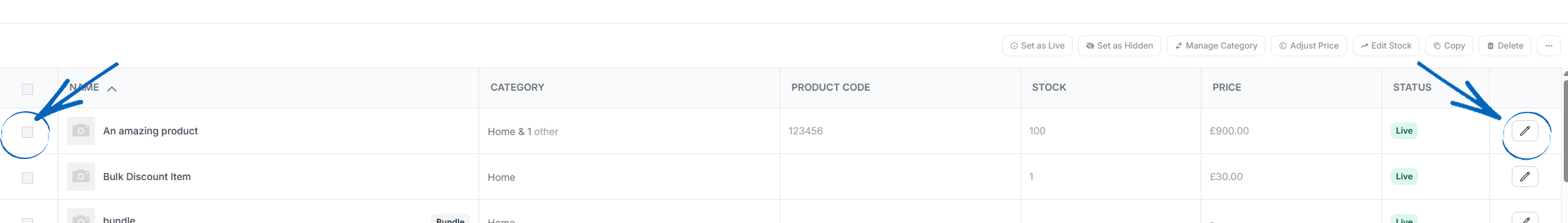 17. Looking at the main table of the Product & Category Manager, you can access the Add/Edit Product window for any product by clicking the pencil icon on the far right-hand side. Alternatively, you can edit one or more products at once by ticking the boxes for each on the left-hand side: