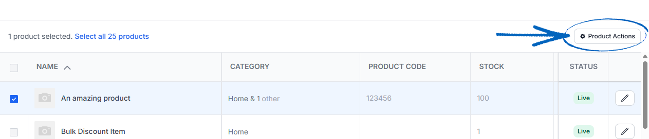 18. On a smaller browser window, when you’ve ticked the box for one or more products, you’ll see the Product Actions button appear on the right-hand side: