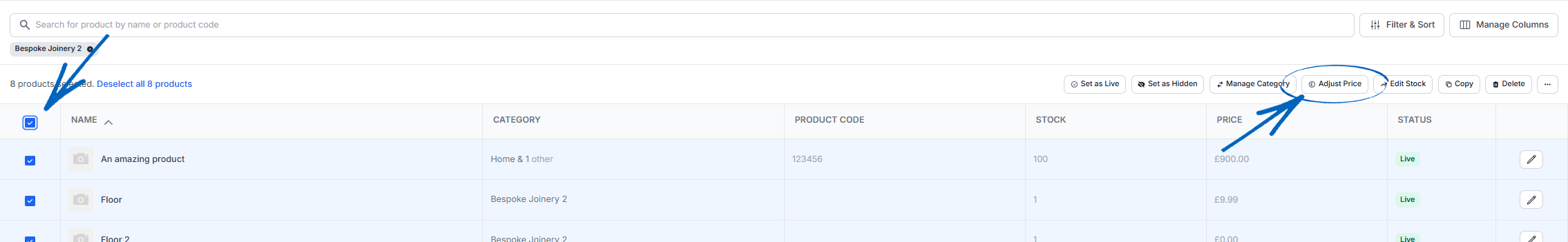 3. Now you can either tick the box in the top left-hand corner of the table to automatically tick the boxes for all products, or tick the boxes next to each product you would like to amend the price of, before clicking the Adjust Price button on the top right-hand side: