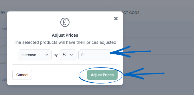 4. In the modal that appears, you can use the drop-down menus to select whether you want to increase or decrease the prices, using either a percentage or a nominal amount, and add by how much in the field provided before clicking the green Adjust Prices button: